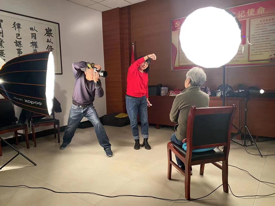无论是在街道、养老院,还是应邀到腿脚不便的老人家中,两名摄影师都要带上背景板、灯具、三脚架等几大包设备上门。刘峰向记者解释,他们师承海派人像摄影技法,讲究的是用光影造型来拍神形兼备的人像。灯具虽沉,却必不可少。